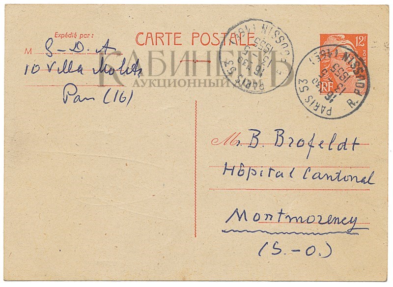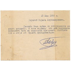 Открытое почтовое письмо Б.М. Брофельдту от Великого князя Андрея Владимировича от 13 мая Париж. 1955 г.