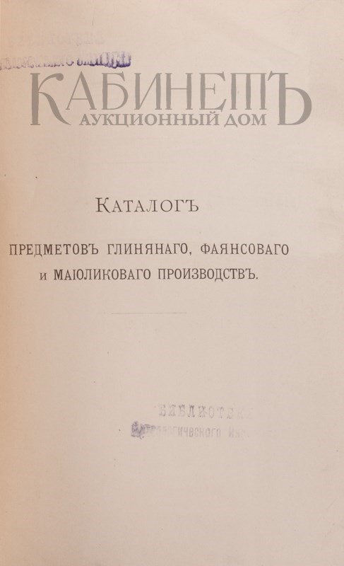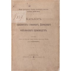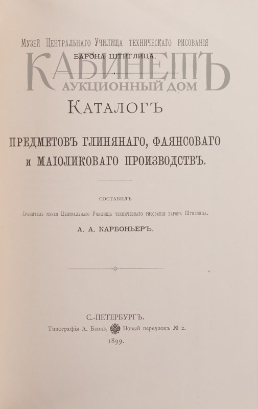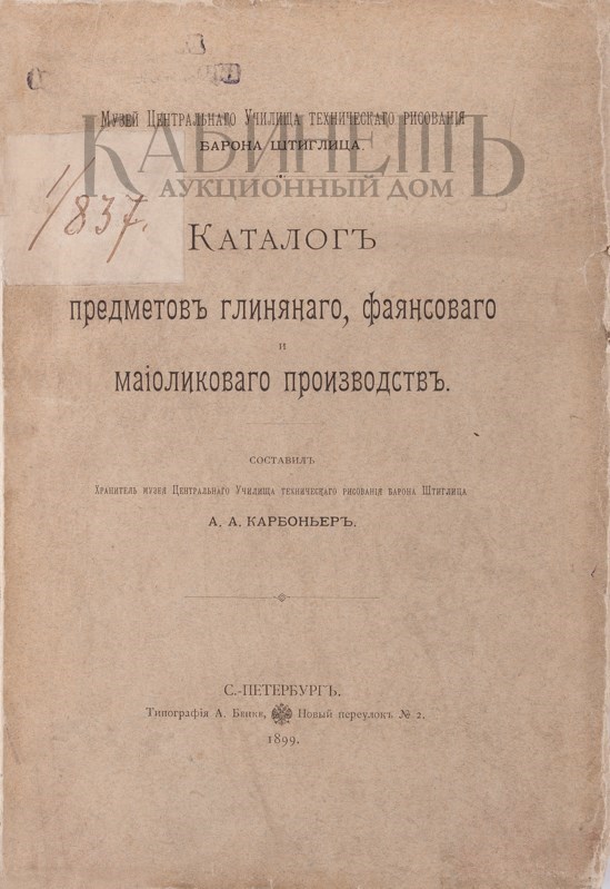 Каталог предметов глиняного, фаянсового и майоликового производств. Составил хранитель музея Центрального Училища технического рисования барона Штиглица А.А. Карбоньер. СПб., Типография А. Бенке, 1899.