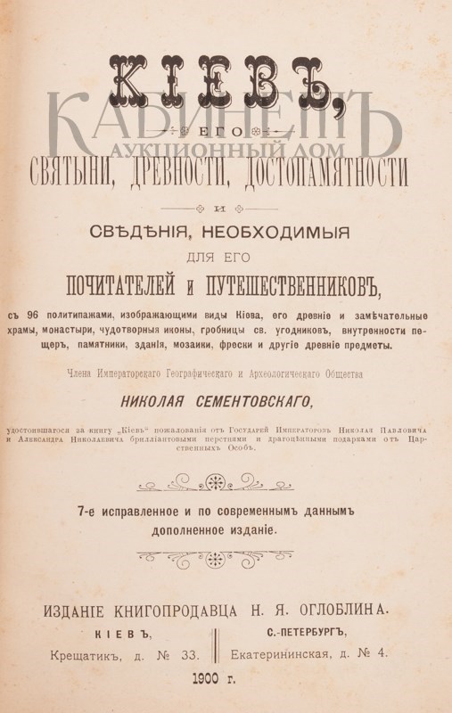 С 96 политипажами в тексте, изображающими виды Киева, его древние и замечательные храмы, монастыри, чудотворные иконы, гробницы Св. угодников, внутренности пещер, памятники, здания, мозаики, фрески и другие древние предметы.