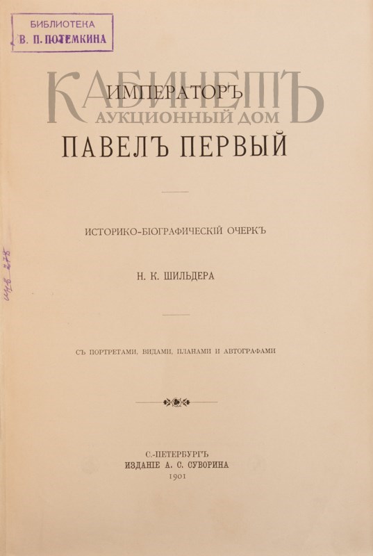 Шильдер Н.К. Император Павел Первый. Историко- биографический очерк Н.К. Шильдера. С портретами, видами, планами и автографами. СПб., Издание А.С. Суворина, 1901.