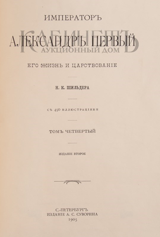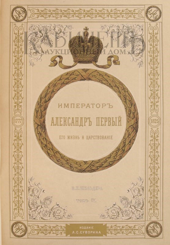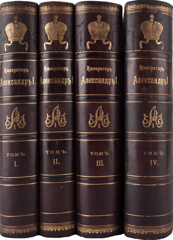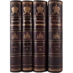 Комплект в четырех издательских полукожаных переплетах с большими коронами. Верхний золотой обрез, издательские обложки сохранены в переплетах. Потертости по краям переплетов, небольшие надрывы по краям корешков. На форзацах следы от наклеек, на титулах следы от вытертых штампов, титул тома IV восстановлен.