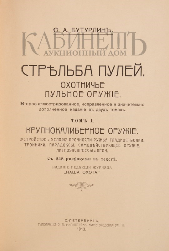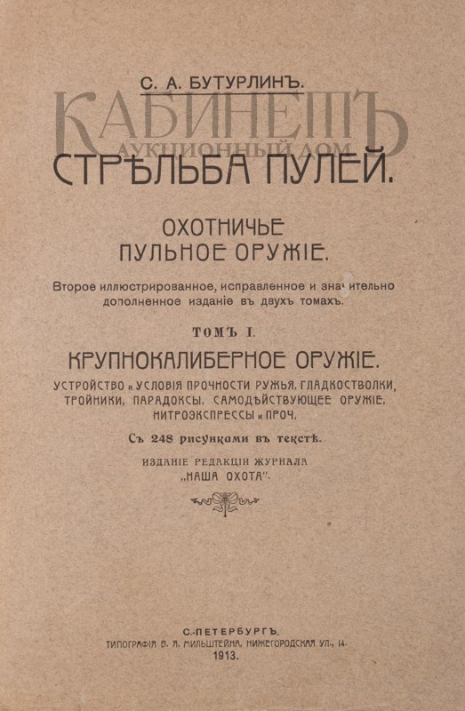 Бутурлин С.А. Стрельба пулей. Охотничье пульное оружие. Второе иллюстрированное и значительно дополненное издание в 2-х томах. Издание редакции журнала «Наша охота». СПб., типография В.Я. Мильштейна, 1913.