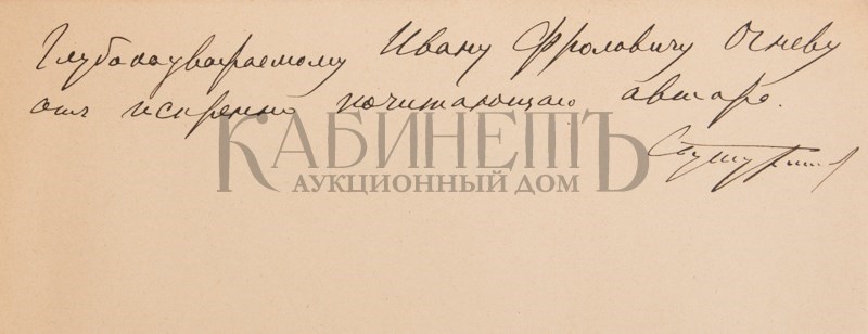 Экземпляр в издательских бумажных обложках, в хорошей сохранности, края обложек аккуратно реставрированы. Для издания изготовлены два современных очень красивых подарочных футляра, полукожа с множественным золотым тиснением. На авантитуле расположен автограф Бутурлина: « Глубокоуважаемому Ивану Фроловичу Огневу от искренно почитаемого автора. С. Бутурлин»