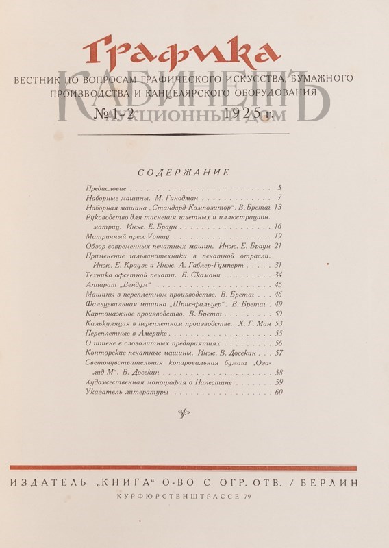 Графика. Вестник по вопросам графического искусства, бумажного производства и канцелярского оборудования. 1925. №№ 1-6. Берлин, «Книга», 1925.