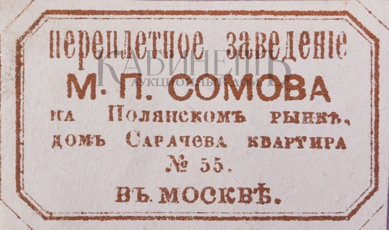 Экземпляр в старинном полукожаном переплете с золотым тиснением по корешку, незначительная утрата в верхней части корешка, незначительные загрязнения, несколько страниц реставрированы бумагой, подрезаны. На форзаце наклейка «Переплетное заведение М.П. Сомова», на нахзаце место от содранной наклейки.