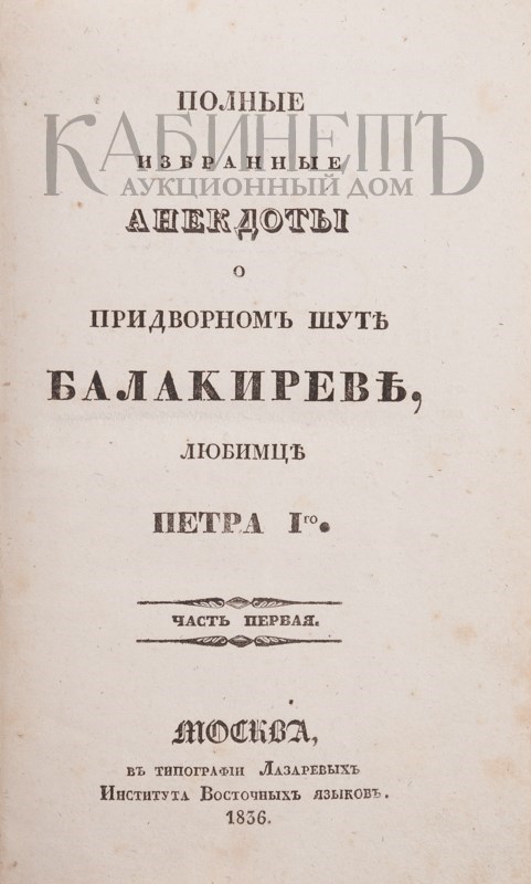 Полные избранные анекдоты о придворном шуте Балакиреве, любимце Петра I. В 4-х частях, в одной книге. М., в типографии Лазаревых Института Восточных языков, 1836.