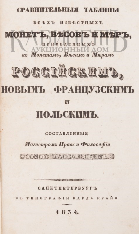 Масальский Ф. Сравнительные таблицы всех известных монет, весов и мер, приведенных к монетам, весам и мерам российским, новым французским и польским. Составленные магистром прав и философии Фомою Массальским. СПб., в типографии Карла Крайя, 1834.