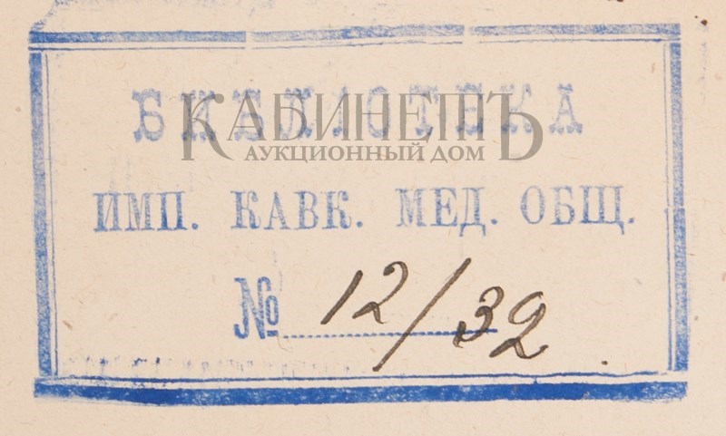 Незначительная трещина на корешке, на форзаце расположен экслибрис: «Библиотека Императорского Кавказского Медицинского общества».