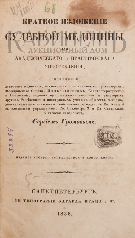 Громов С. Краткое изложение судебной медицины для академического и практического употребления. Издание второе, исправленное и дополненное. СПб., в типографии Эдуарда Праца и Ко, 1838.