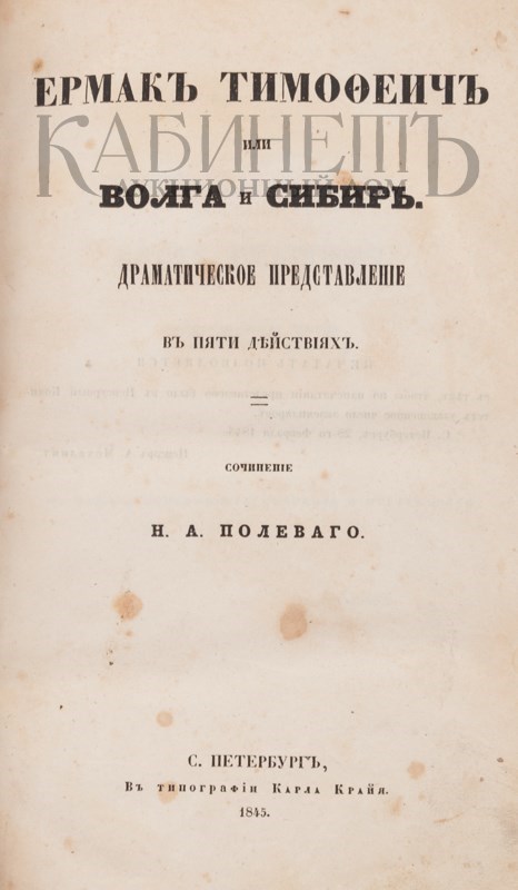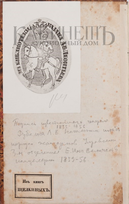 Экземпляр в полукожаном переплете эпохи. Потертости, трещина на корешке, «лисьи пятна» на страницах. На форзац наклеены два экслибриса - «Из библиотеки казака А.В. Леонтьева» и «Из книг Щелкиных». Рядом дарственная надпись за подписью начальника штаба Корпуса жандармов и управляющего III отделением Собственной Е.И.В. Канцелярии Л.В. Дубельта.