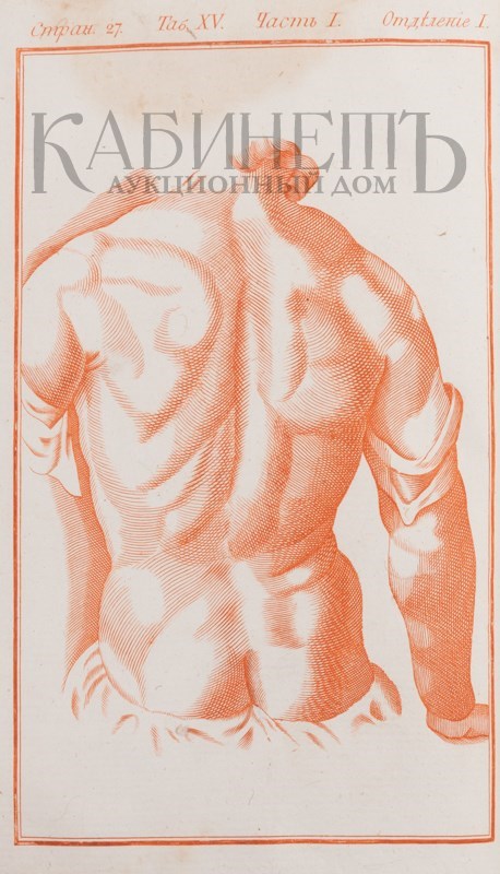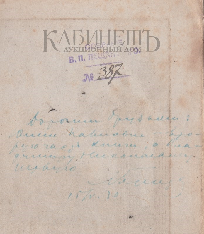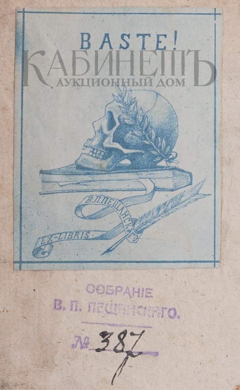 Экземпляр в кожаном переплете эпохи. Потертости переплета, небольшая трещина в верхней части корешка, утрата кусочка кожи в нижней части корешка. Верхняя часть книжного блока подмочена. На форзац наклеен экслибрис В.П. Пещанского, на форзаце, фронтисписе и титуле штемпельный экслибрис В.П. Пещанского. Утрата 4 ил. (№№ 17, 18, 19, 20).