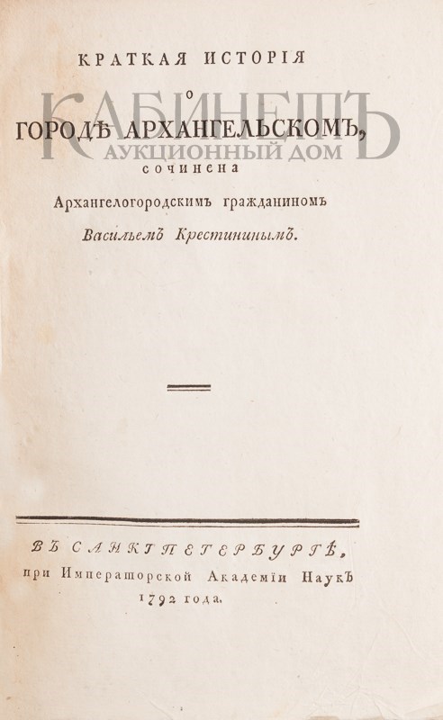 Крестинин Василий Васильевич (1729–1795) – историк Двинской земли и административный деятель, основатель исторического общества в Архангельске. Кроме истории города Архангельска, издал еще две книги: «Исторические начатки о двинском народе» (СПб., 1784) и «Начертание истории города Холмогор» (СПб., 1790). Основным материалом для написания книги по истории Архангельска до XVIII столетия послужили собранные автором рукописи, а для периода с 1700 года – воспоминания современников.