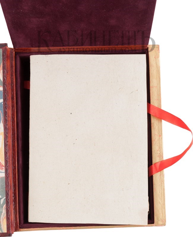 Чистый, необрезанный, экземпляр в «слепой» обложке более позднего времени. Для книги изготовлены современ- ная коробка с кожаным корешком, имитирующая книгу в переплете, и футляр.