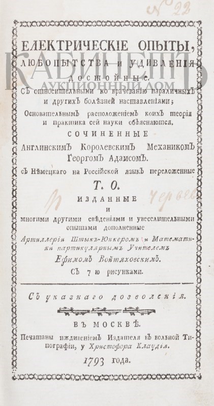 Адамс Дж. Електрические опыты, любопытства и удивления достойные. С относительными ко врачеванию параличных и других болезней наставлениями; Основательным расположением коих теория и практика сей науки объясняются. Сочиненные Англинским Королевским Механиком Георгом Адамсом. С немецкого на российский язык переложенные Т.О. Изданные и многими другими сведениями и увеселительными опытами дополненные ... Ефимом Войтяховским. С 7 ю рисунками. М., Печатаны иждивением издателя в вольной Типографии, у Христофора Клаудия, 1793.