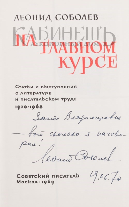 Леонид Соболев. Автограф. Дарственная надпись Л.С. Соболева на книге: Соболев Л. На главном курсе. М., Советский писатель, 1969.