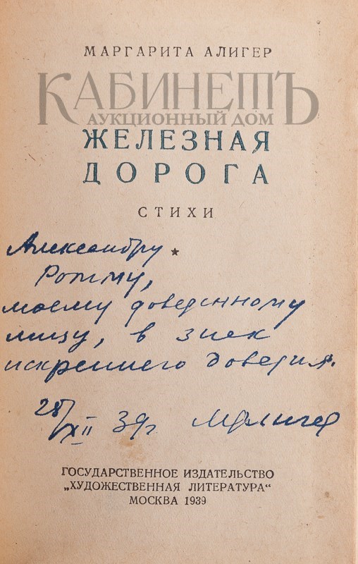 Экземпляр в коленкоровом издательском переплете. На титульном листе автограф М. Алигер: «Александру /Ромму, /моему доверенному / лицу, в знак /искреннего доверия. / 28/ XII 39г. МАлигер».