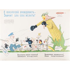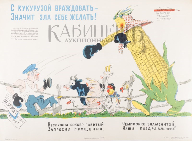 «С кукурузой враждовать – значит зла себе желать! Неспроста боксер побитый запросил прощения. Чемпионке знаменитой наши поздравления!» «Боевой карандаш» №75 (356). Л., Издательство «Художник РСФСР», 1959.