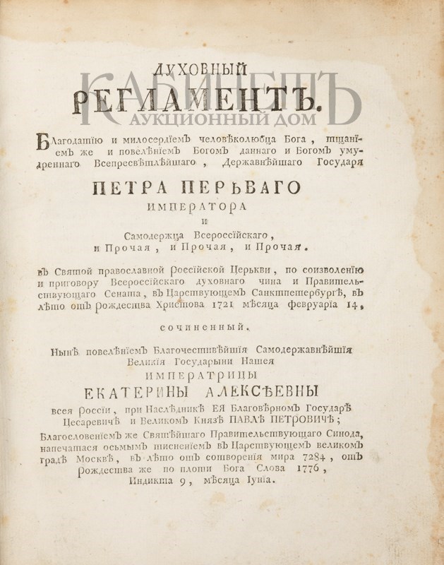 Архив аукциона №20(66) Лот 10 Духовный регламент. Благодатиею и милосердием человеколюбца Бога, тщанием же и повелением