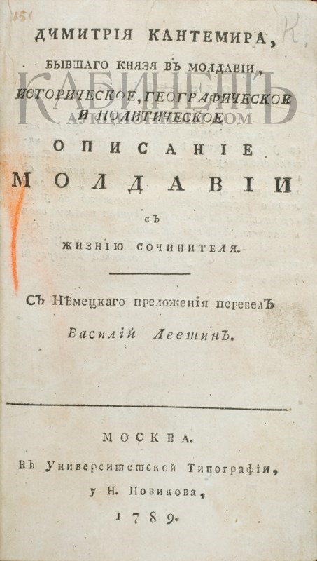 Дмитрия Кантемира, бывшего князя в Молдавии, историческое, географическое и политическое описание Молдавии с жизнью сочинителя. С немецкого переложения перевел Василий Левшин. М., в Университетской типографии, 1789.
