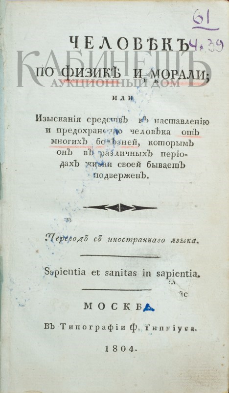 Ганн А. Человек по физике и морали; или Изыскания средств к наставлению и предохранению человека от многих болезней, которым он в различных периодах жизни своей бывает подвержен. М., в типографии Ф. Гиппиуса, 1804.