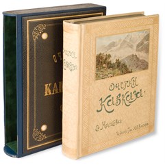 Экземпляр в издательском коленкоровом переплете с золотым и цветным тиснением и вклейкой на верхней крышке, в картонажном футляре. Тонированные с узором обрезы. Форзацы из бумаги растительного орнамента. Владельческая надпись на оборотной стороне фронтисписа.