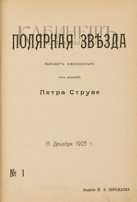 Полярная Звезда – еженедельный журнал, выходивший под ред. П. Струве с 15 декабря 1905 г. по 19 марта 1906 г. Всего вышло 14 номеров. Журнал ставил своей задачей «борьбу за нашу духовную самобытность и за политическое освобождение родины»,… борьбу за то, «чтобы общественно-политическое бытие русской нации было непоколебимо утверждено на основе свободы, равенства и социальной справедливости».