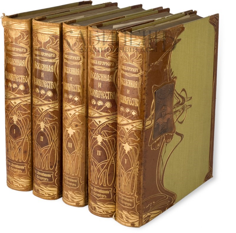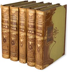Экземпляр в издательских полукожаных переплетах в стиле «модерн» с золотым тиснением по корешкам и крышкам, с латунными накладками, незначительные потертости корешков, незначительный надрывчик по корешку в томе I.