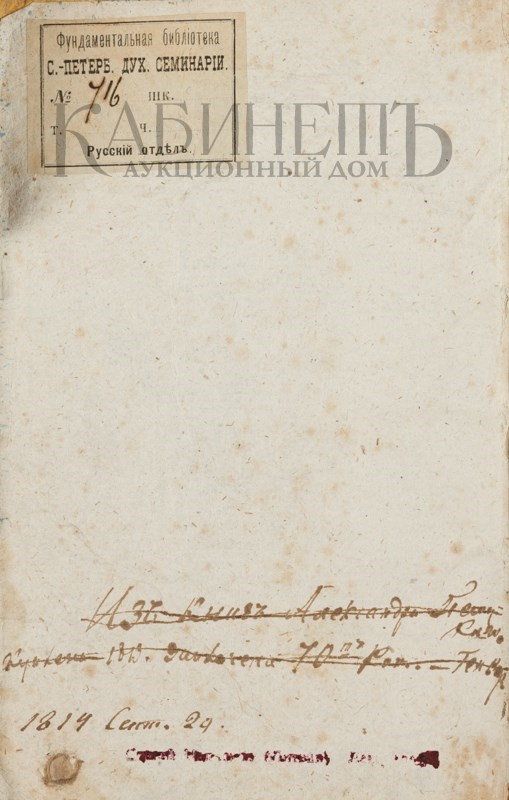 Экземпляр в старинном составном переплете. «Уставший» переплет. Дореволюционная бумажная наклейка на корешке и на форзаце. Дореволюционная библиотечная печать и стертый номер (чернила) на титуле. Полустертый владельческий штамп на с. 17 и обороте с. 385, маленький надрыв с. 17. Букинистические пометы на обороте нижней крышки.