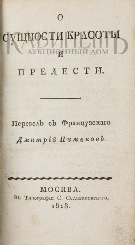 О сущности красоты и прелести. Перевел с французского Дмитрий Пименов. М., в Типографии С. Селивановского, 1818.