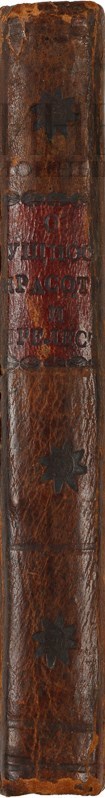 Экземпляр в старинном полукожаном переплете. Утраты бумаги внизу верхней крышки, следы жучка на нижней крышке у корешка.