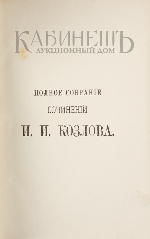 Козлов И.И. Полное собрание сочинений. Под ред. Арс. И. Введенского. С биографическим очерком и портретом И.И. Козлова, гравированным на стали Ф.А. Брокгаузом в Лейпциге. 3-е издание. СПб., А.Ф. Маркс, [1910-е].