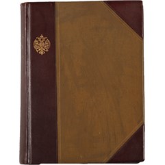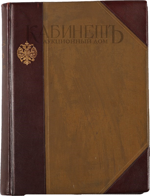 Экземпляр в двух старинных полукожаных переплетах с золотым тиснением на корешках и золототисненным государственным гербом на верхних крышках. Некоторые листы и вклейки подклеены к блоку (первый блок), временные пятна (второй блок). Номер в уголке титула.