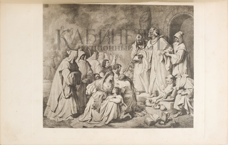 Экземпляр в издательских цельноколенкоровых переплетах с золотым тиснением, в современном футляре. Обрезы тонированы под «мрамор». Ляссе. Загрязнение в уголке одной страницы и одной вклейки в томе III. Букинистические штампы на обороте свободного листа нахзаца тома I, III.