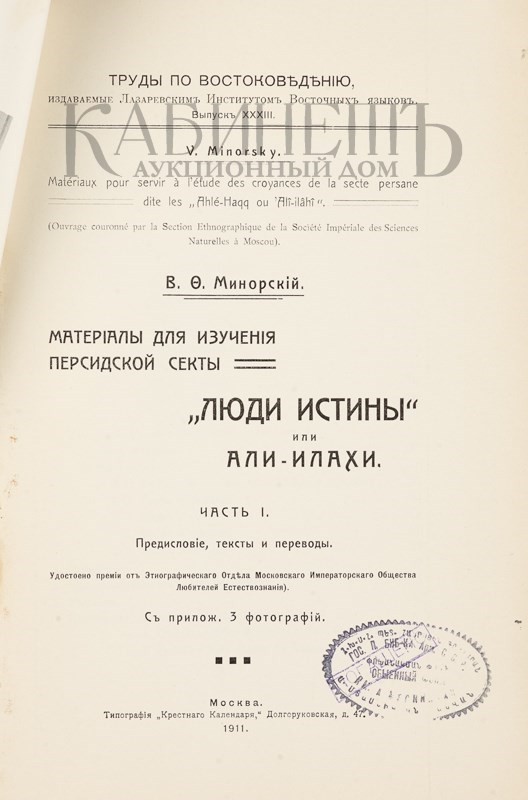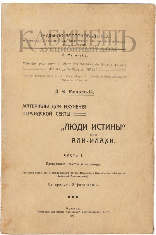 Минорский В.Ф. Материалы для изучения персидской секты «Люди Истины» или Али-Илахи. Часть I. М., типография «Крестного календаря», 1911.