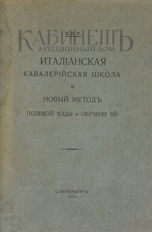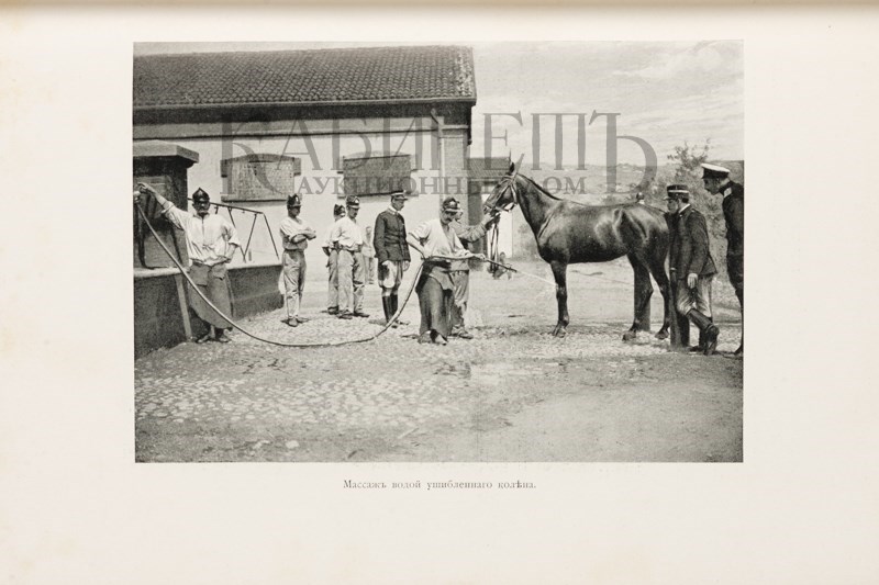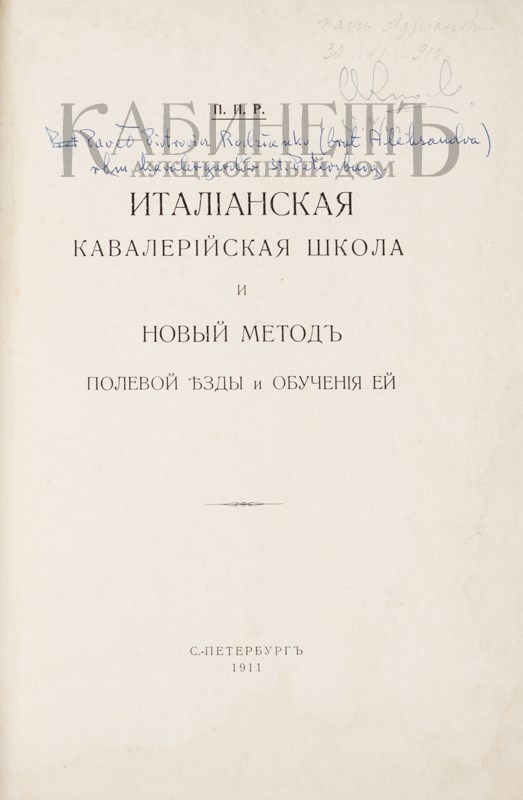 Экземпляр в современном полукожаном переплете. Золотое тиснение и бинты на корешке, ляссе. Сохранена издательская шрифтовая обложка. Незначительные разводы по краям титула, бледные «лисьи» пятна, аккуратная реставрация нижней обложки с оборотной стороны. Экслибрис на обороте верхней обложки. Владельческие надписи на титуле. В книге описаны приемы обучения и полевой езды, выработанные в итальянской кавалерийской школе. Прилагаются многочисленные иллюстрации в тексте, в лист и на отдельных вклейках.
