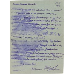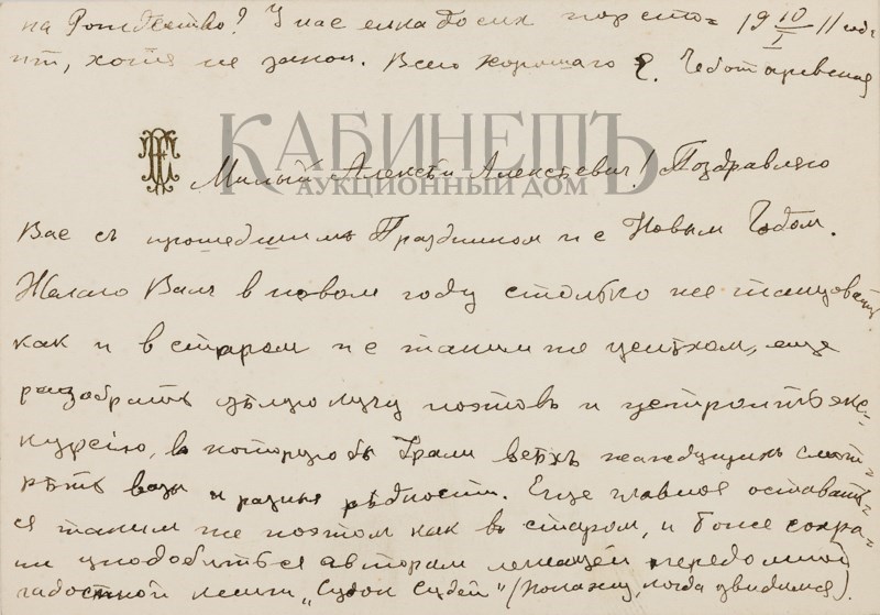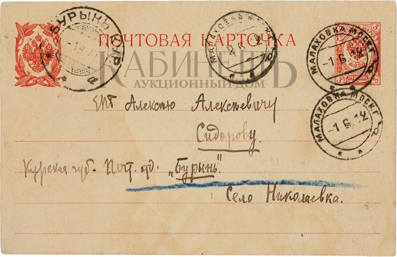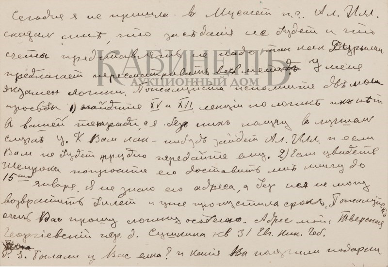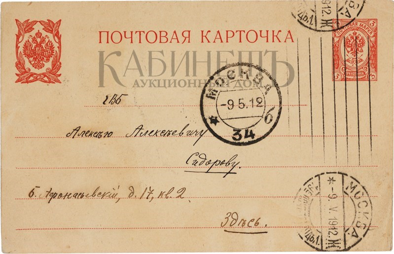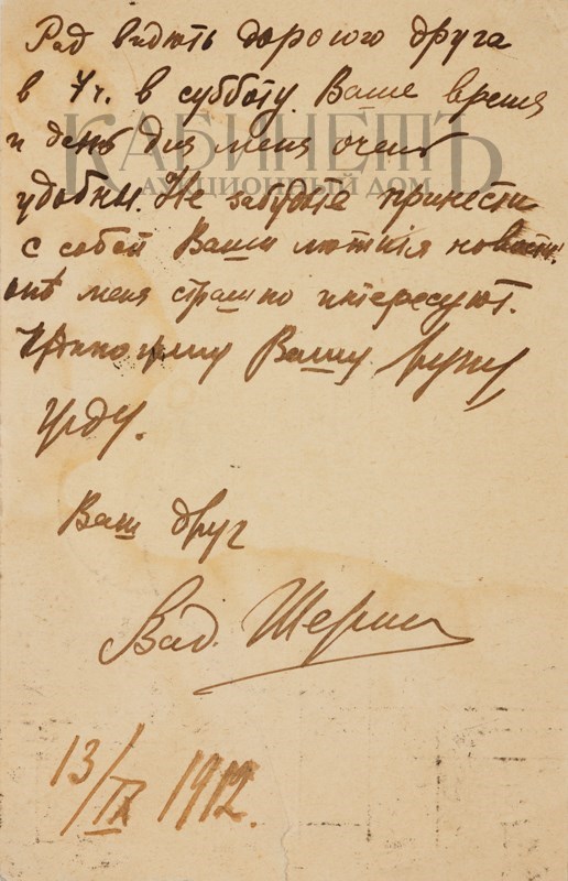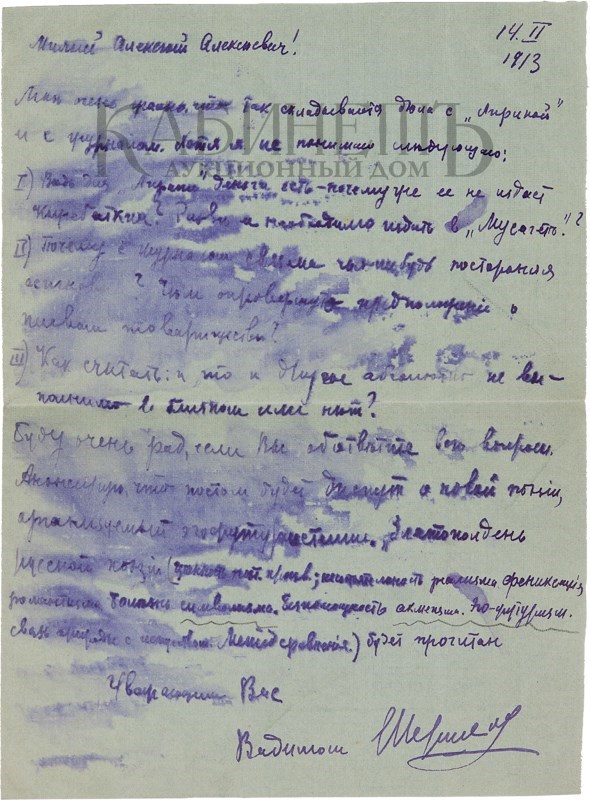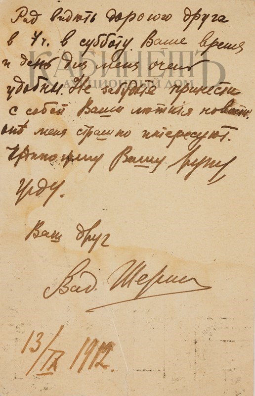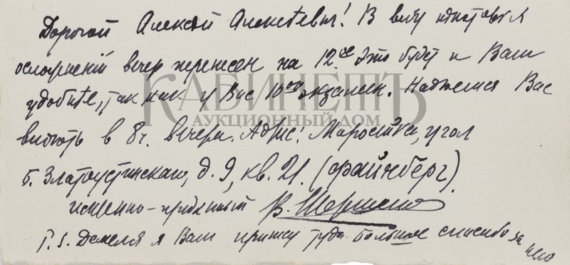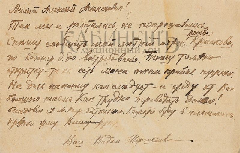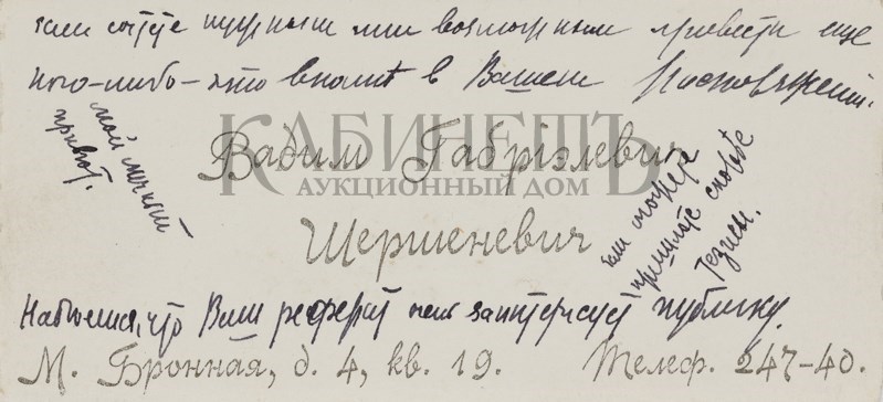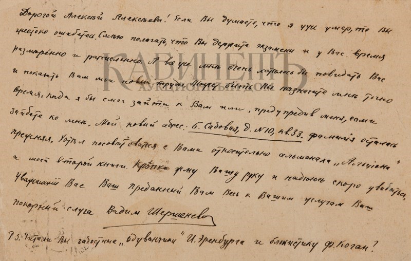 Текст одного из писем: “Дорогой Алексей Алексеевич! Если Вы думаете, что я уже умер, то Вы жестоко ошибаетесь. Смею полагать, что Вы держите экзамены и у Вас время размерено и расчислено. А все же мне очень хотелось бы повидать Вас и показать Вам мои новые труды. Может быть, Вы назначите мне точно время, когда я бы смог зайти к Вам или предупредив меня, сами зайдете ко мне. Мой новый адрес: Б. Садовая, д.10, кв.33. фамилия осталась прежняя. Хотел посоветоваться с Вами относительно альманаха «Альциона» и моей второй книги. Крепко жму Вашу руку и надеюсь скоро увидатся. Уважающий Вас Ваш преданный Вам Весь к Вашим услугам Ваш покорный слуга Вадим Шершеневич. P.S.Читали Вы гадостные “Одуванчики» И. Эренбурга и блокистику Ф.Коган? 9.5.1912 г.»