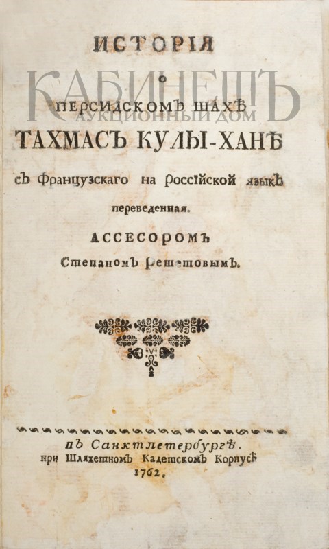 Клостр А. История о персидском шахе Тахмас Кулы-хане. С французского на российский язык переведенная ассесором Степаном Решетовым. СПб., при Шляхетном Кадетском Корпусе, 1762.