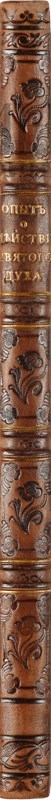 Экземпляр в современном цельнокожаном переплете. Тиснение золотом по крышкам и корешку. Владельческая надпись на титуле (карандашом) и обороте титула (орешковые чернила). Незначительные разводы от воды в начале блока.