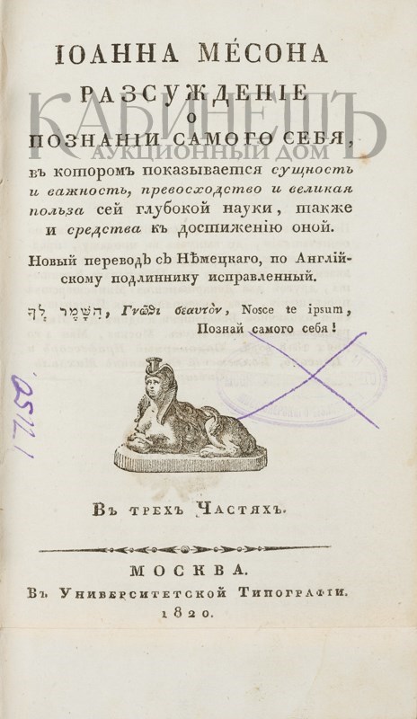 Иоанна Месона рассуждение о познании самого себя, в котором показывается сущность и важность, превосходство и великая польза сей глубокой науки, также и средства к достижению оной. Новый перевод с немецкого, по английскому подлиннику исправленный. В 3-х частях. М., в университетской типографии, 1820.