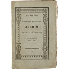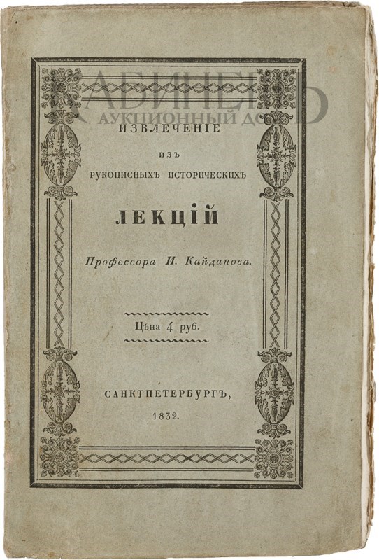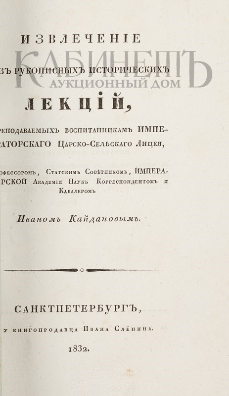 Кайданов И. Извлечение из рукописных исторических лекций, преподаваемых воспитанникам Императорского Царско- Сельского лицея, профессором, статским советником, Императорской Академии наук корреспондентом и кавалером Иваном Кайдановым. В 2-х книгах. СПб., у книгопродавца Ивана Слёнина, 1832.