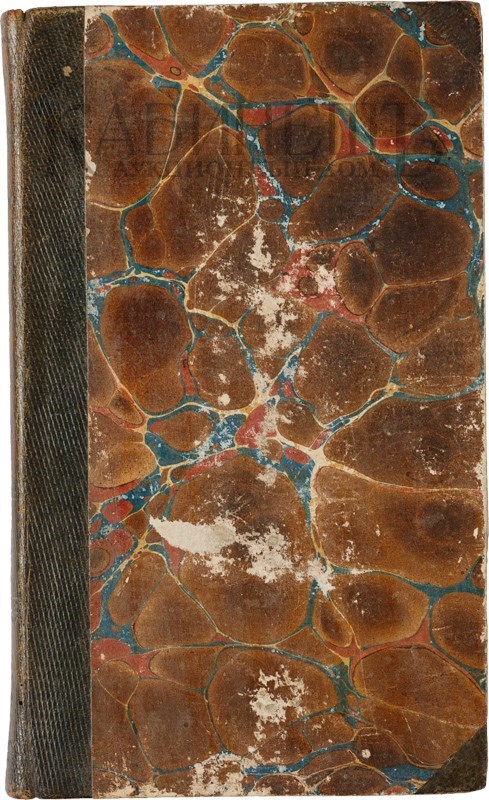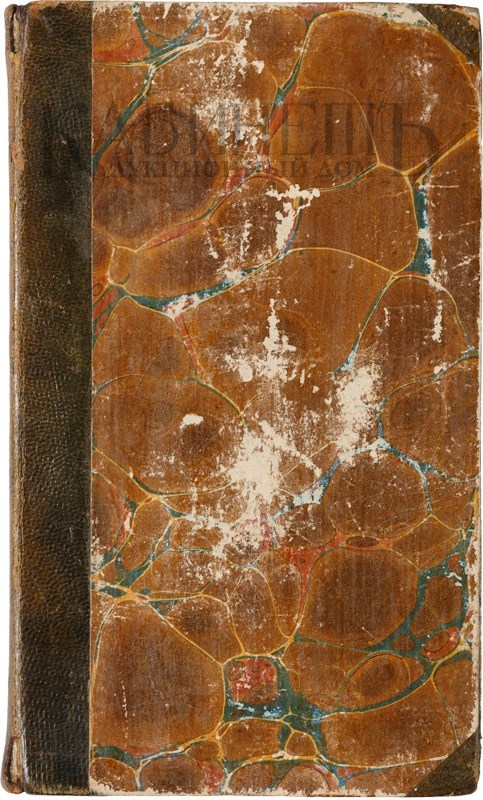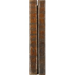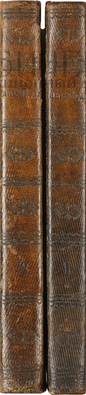 В двух старинных полукожаных переплетах. Блинтовое тиснение на корешках: виньетки, название книги и номер части. Крапленые обрезы. В хорошем состоянии. Утрата маленького фрагмента кожи вверху и внизу корешка (часть II). Встречаются «лисьи» пятна.