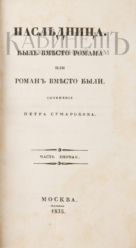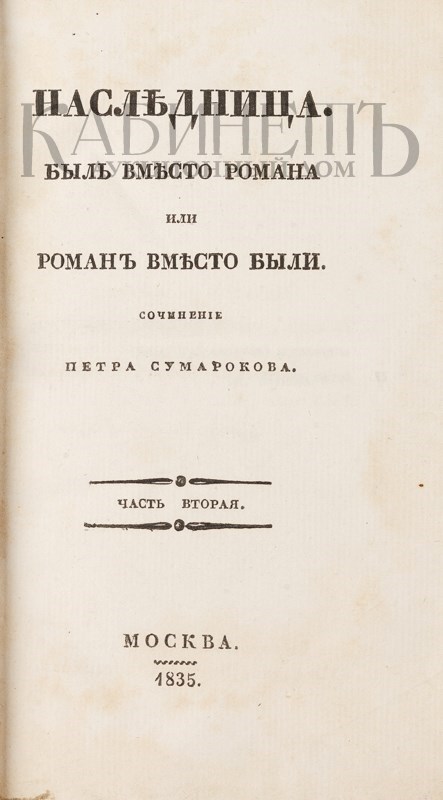 Сумароков П. Наследница. Быль вместо романа, или роман вместо были. В 2-х частях. М., в тип. Лазаревых Института Восточных языков, 1835.
