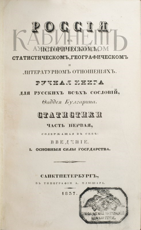 1. Булгарин Ф. Россия в историческом и статистическом, географическом и литературном отношениях. Ручная книга для русских всех сословий. В 4-х частях. СПб., в типографии А. Плюшара, 1837.