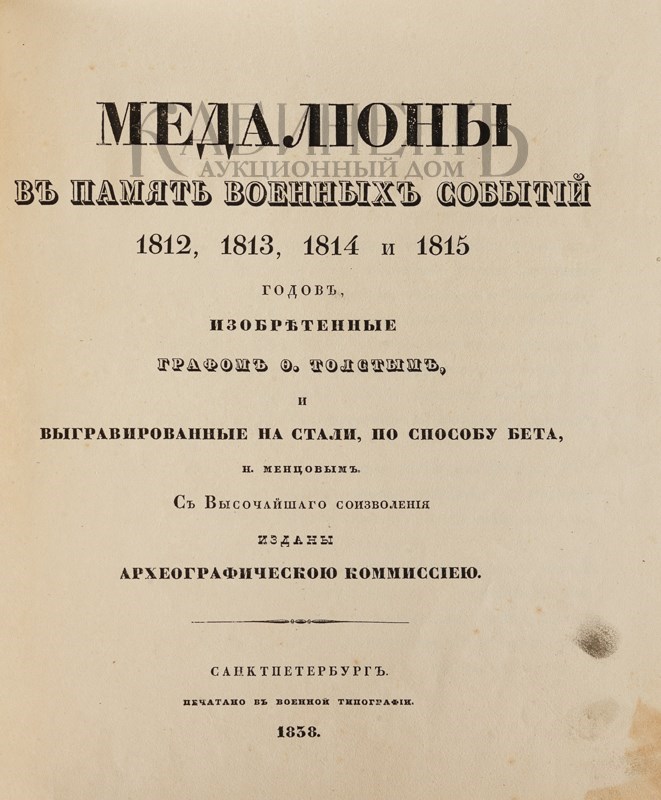 Граф Толстой Федор Петрович (1783–1873) –скульптор и медальер, живописец и рисовальщик, вице-президент Академии художеств. Серию из 20 рельефов с аллегорическими сценами на тему Отечественной войны 1812 г. и Заграничного похода русской армии 1813–1814 гг. Ф.П. Толстой создал в 1814–1836 гг. Медальоны Толстого приобрели широкую известность не только в России, но и за рубежом. Он был избран членом почти всех европейских академий художеств. По образцам медальонов в 1834–1837 гг. на Санкт-Петербургском монетном дворе печатались памятные медали.
