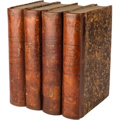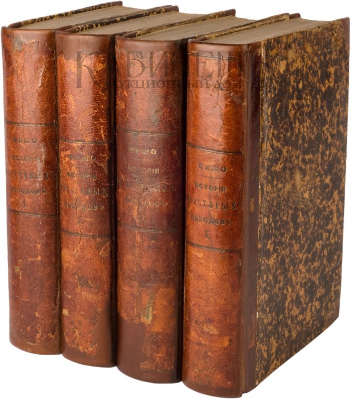 Экземпляр в старинных полукожаных переплетах. Крапленые обрезы. Аккуратная реставрация корешков (дублированы), уголки поновлены, встречаются разводы от воды, пятна на некоторых страницах. Дореволюционный экслибрис «БМАК» на титульном листе и с. 101 каждого тома, он же вытиснен на верхних крышках. Мытые титулы и уголки с. 17. Нет части IV.