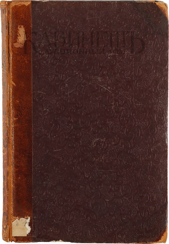 Экземпляр в старинном полукожаном переплете, трещина по корешку, загрязнения, пятна, пометки синими и орешковыми чернилами.