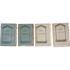 Экземпляр в издательских шрифтовых обложках. «Лисьи» пятна, небольшая реставрация обложек томов I, II и авантитула тома I (уголок), залом нижней обложки томов I, II, разводы от воды в томах III, IV, утрата маленького фрагмента последней страницы (оглавление) тома II, поля потрепаны. Поля страниц неодинаковые (некоторые подрезаны по правому краю). Сведенные штампы на титулах томов I, IV. Неразрезанный экземпляр.
