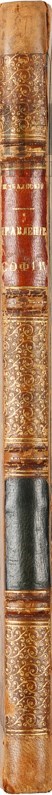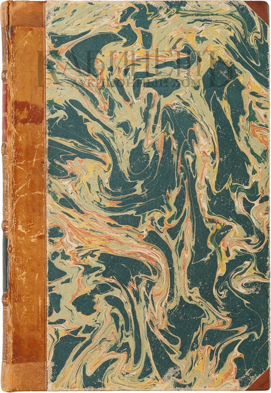 Экземпляр в старинном составном переплете: кожаный корешок с золотым тиснением и двумя кожаными наклейками, крышки оклеены узорной бумагой, уголки из коленкора. Хорошая сохранность. На корешке вверху надставлена кожа, потертости на сгибах корешка.