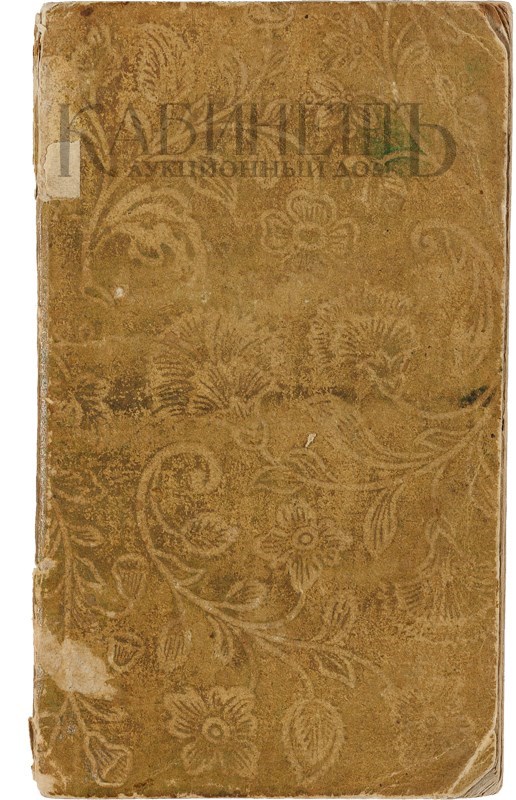Экземпляр в старинной владельческой обертке. Утрата фрагмента корешка. Следы бумаги на обороте титула. Пометы орешковыми чернилами на полях.