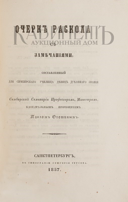 Охотин П. Очерк раскола с замечаниями, составленный для Симбирского училища девиц духовного звания Симбирской семинарии профессором, магистром, кафедральным протоиереем Павлом Охотиным. СПб., в типографии Г. Трусова, 1857.